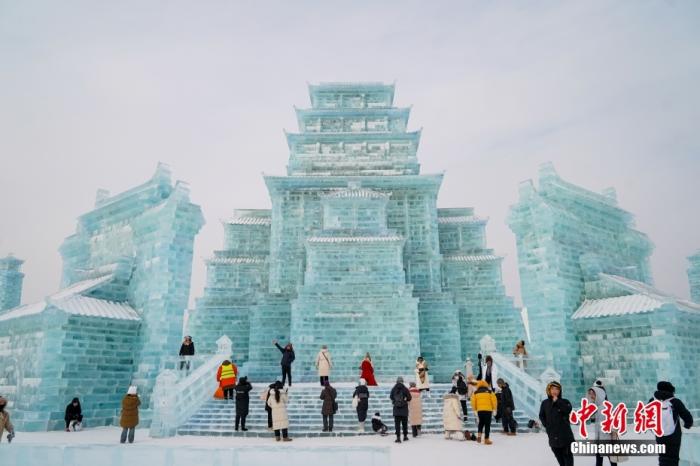 资料图:哈尔滨冰雪大世界内的冰雕吸引游客观看。中新社发 赵宇航 摄“南北互换” 冰雪游热度持续