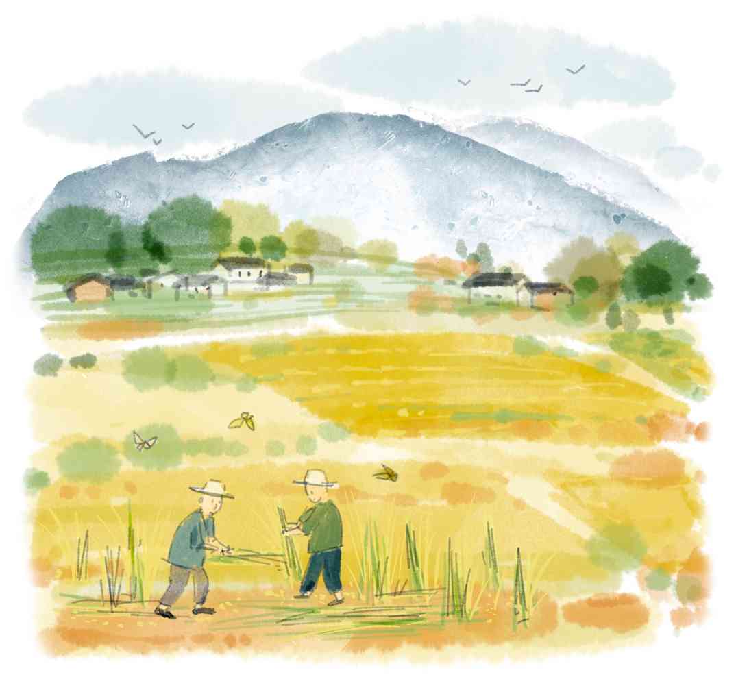 谁能想到,眼前这片连成片的沃土,正是“山上换山下”改革结出的沉实硕果。从前,零散薄田错落在山坡上,扛不住汛旱,亩产收益也总在低位打转;改革东风一吹,土地置换整合,终于成了眼下卧在山下河边的连片良田,抗风险能力提高不说,每一寸土地都多产了粮,村民的腰包也跟着一天天鼓了起来。田间早已是丰收的模样:有人扛着成捆稻子,脚步轻快地走向巨大木槽;有人扬起稻束,往槽上狠狠一摔,啪的一声,谷粒簌簌落下,撞出脆生生的响,裹着稻香飘出老远。稻浪间的小生灵更添生机,粉白、黄褐的蝴蝶绕着稻穗翩跹,时而停在稻尖歇脚,时而追着风掠过田埂。