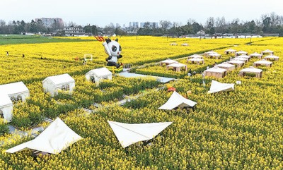 四川省成都市崇州市在油菜花田里设置露营地和火锅店,以花为媒,吸引游客前来体验乡村休闲游。