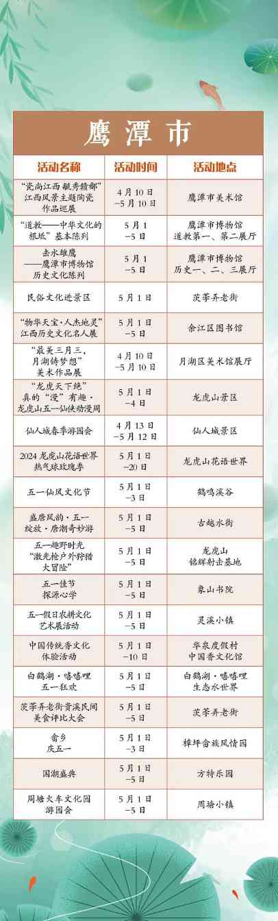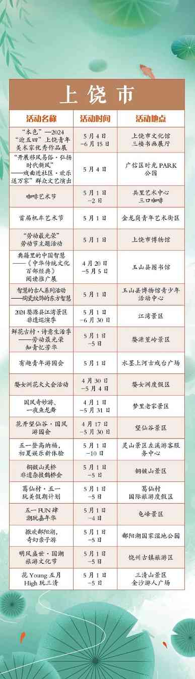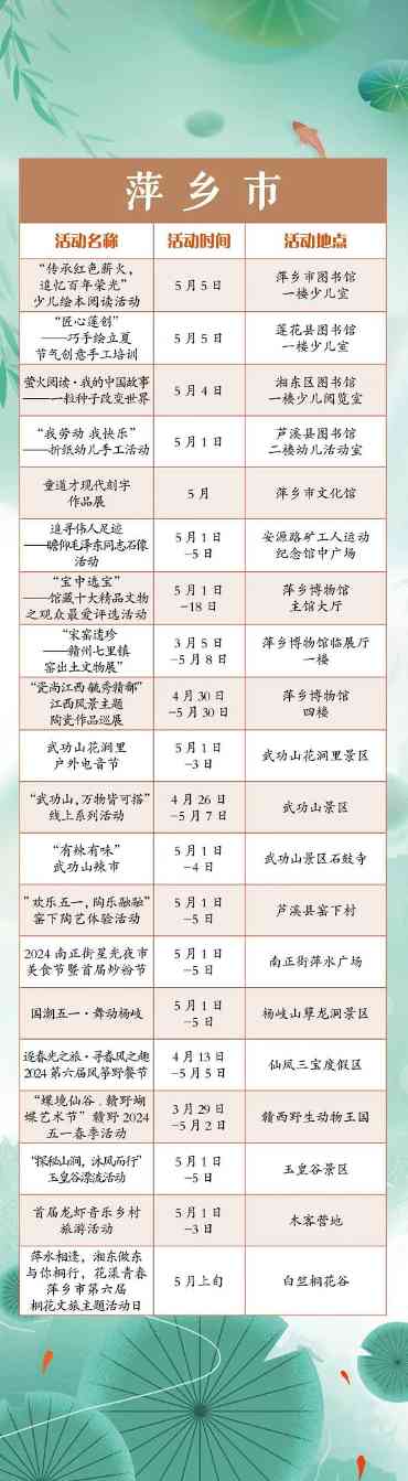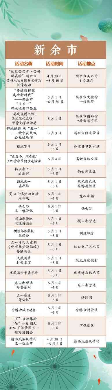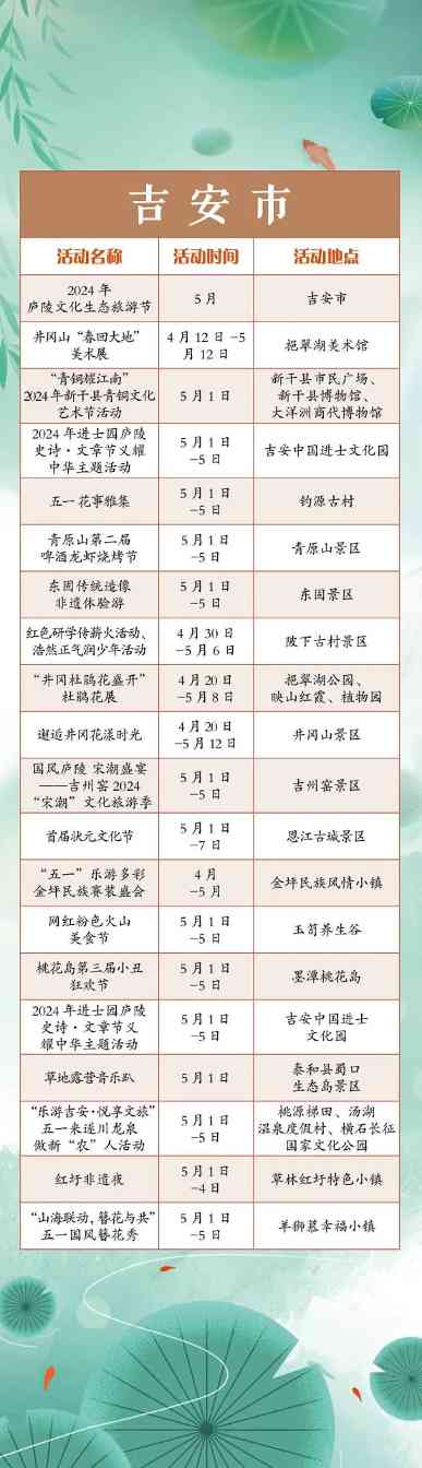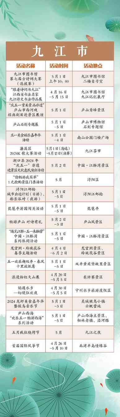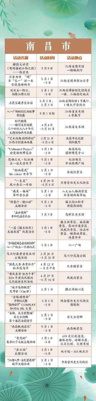 “五一”小长假,江西全省共将举办1300余项文旅活动。涵盖公共文化、文化演出、展览展演、惠民活动等多个方面。假期出门便可享用“文旅大餐”,总有一款适合你,一起来看看吧!“五一”小长假,江西全省共将举办1300余项文旅活动。涵盖公共文化、文化演出、展览展演、惠民活动等多个方面。假期出门便可享用“文旅大餐”,总有一款适合你,一起来看看吧!