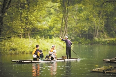 游客和宠物在湖南郴州飞天山景区中乘坐竹筏。